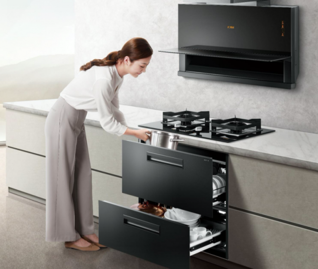 另一方面,方太产品设计团队认为,在满足产品功能性的同时,还需要合理规划空间。烟机顺应顺势上排位于上方,灶蒸烤部分则可以位居下方,或可多出碗篮的空间摆放杂物,多个厨房电器,垂直排列,仅占据平面1平米,厨房空间利用率更高。