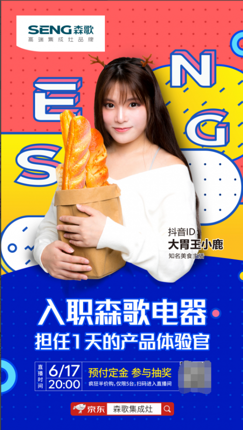 6月17日,抖音美食网红“大胃王小鹿”正式入职森歌电器1日,作为对美食更有感觉的网红博主,担任起了森歌集成灶的“产品体验官”,深入总部工厂,体验厨电产品的生产,近距离接触通过厨电制造美食。在17日晚京东直播间,更是挑战了9寸超巨型汉堡。造就了直播间观看人次133万+,获赞37万+的爆红盛况;区别于传统的邀请网红直播,森歌更在乎这些KOL达人们的亲临体验,让网红的推荐更为真实,从不同维度、不同人群来阐述产品的价值。