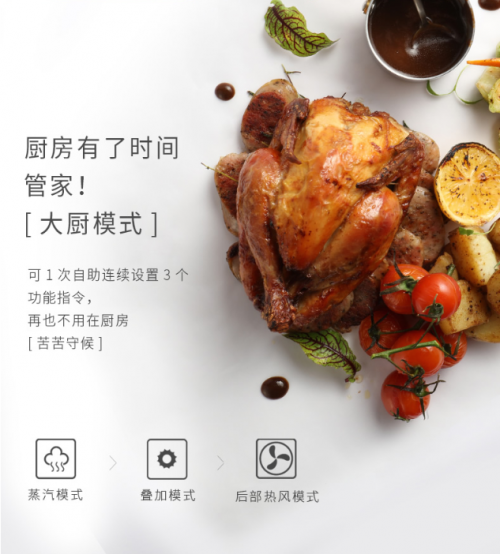说到智能,就不能不提蒸烤箱的智能大厨功能了,一次可以设定多个任务叠加哦。比如说做牛排可以选择先蒸后烤,这样做出来的牛排更加鲜嫩多汁。而智能大厨就可以在一开始的时候就可以分别设置好蒸跟烤的时间和温度,机器会在蒸完的时候直接执行烤功能,不需要再屁颠屁颠跑到蒸烤箱面前再设置一次烤模式哦,是不是超级体贴的。完全不像传统的炉灶,做饭的时候需要一直守在那里呀,有这个时间用来追剧刷手机它不香吗?