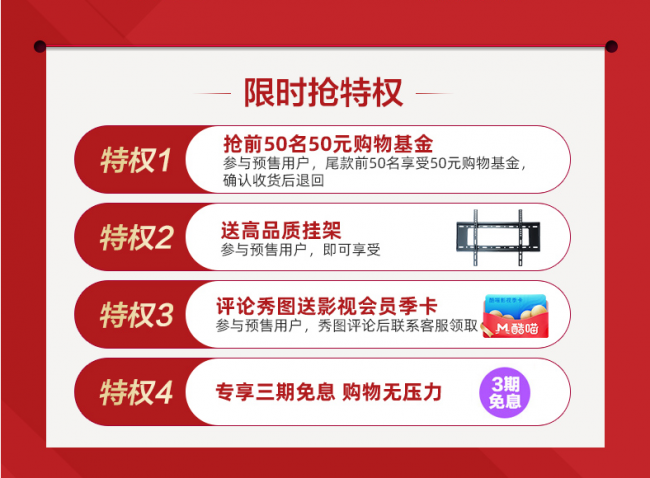 此次双十一大促,熊猫39F8A采用“发售日同价双十一”战略,在11月1日发售的价格最低仅为849元。同时,在11月1日支付尾款的消费者还可以享受50元购物基金、赠送高品质挂架、评论秀图送影视会员季卡及分期付款三期免息四大限时特权。可以说,这款性价比出众的39英寸智能卧室电视产品,现在绝对值得入手。