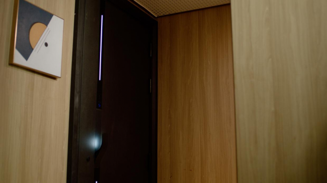 在设计上,这扇门兼具美感和科技感。材质采用胡桃木纹理提升门体质感,并独创感应氛围的灯带设计,无论是行人路过还是家人回家,都能从灯光中感受到温馨的暖意。