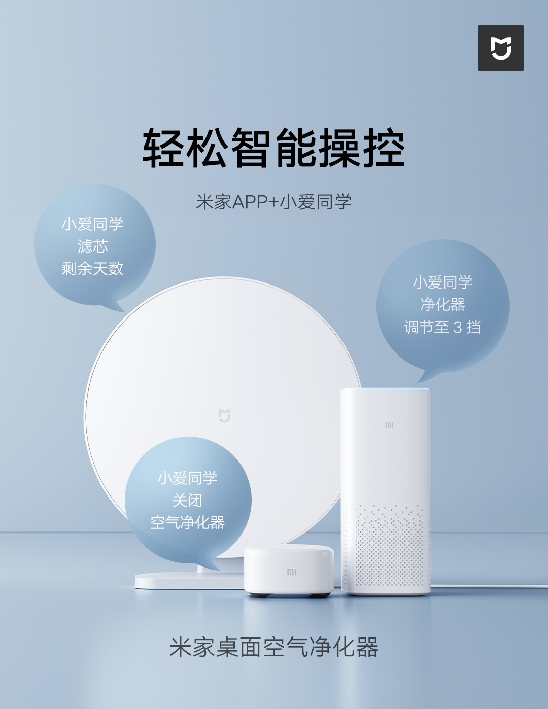 米家桌面空气净化器支持通过wi-fi链接米家APP,可以随时了解滤芯寿命,还能远程操控、开关净化器,下班忘了关空气净化器,打开手机就能关闭。同时支持和其他的米家智能设备进行联动。支持使用小爱同学进行语音操控,上班手忙脚乱,好空气“说”来就来!