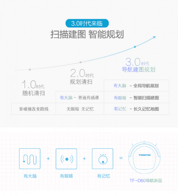 斐纳TOMEFON-TF-D60扫地机器人全新升级的3.0规划清洁时代,让我们彻底告别扫地机乱跑乱撞的清洁时代。通过所搭载的斐纳TOMEFON智能专用芯片,能对全屋进行高精度定位和自主导航,再根据智能构图系统的地图测绘,实时建立精准的家居地图,让机器人清扫有目标不乱撞,并且通过仿生算法法则进行自主推算室内分区方案,实现科学高效的清扫路径让全屋覆盖率增高。