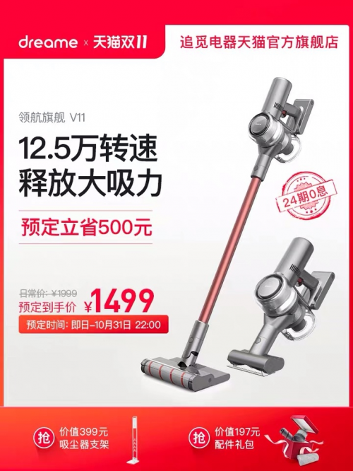 即日起至10月31日前,追觅无线吸尘器V11在天猫平台-追觅电器旗舰店开启预售通道,只需预付定金100元,即可立省500元,到手价仅为1499元!同时,还有多重礼遇惊喜等你来拿,让你的11.11快人一步!