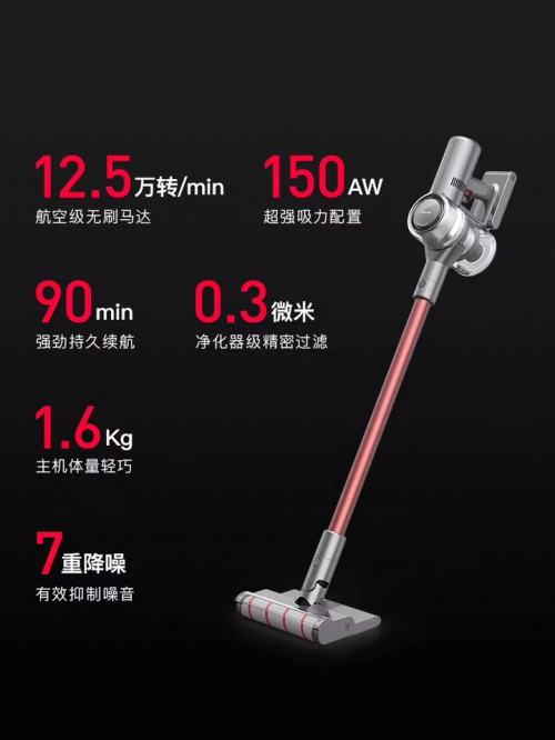 对于吸尘器的选购,大家最关心的就是吸力。追觅无线吸尘器V11搭载的航空级马达——追觅Space4.0高速马达,能够实现125000转速/分钟,带动150AW强劲吸力,可以精密过滤到0.3微米,直击卫生死角中的灰尘和高效除螨。同时该款机型在噪音控制方面也表现得十分出色,7重降噪设置,有效抑制运行噪音,让用户安静清洁。