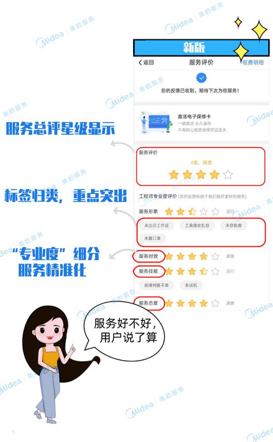 近日,美的“服务评价”系统全新升级上线,创新性地推出五维服务评价体系:借助用户端、服务端和管理平台的数据化运营能力,在线收集用户服务反馈,具象化展示工程师服务评价,打造更细微感知用户体验、更有效监控服务质量的售后评价体系。