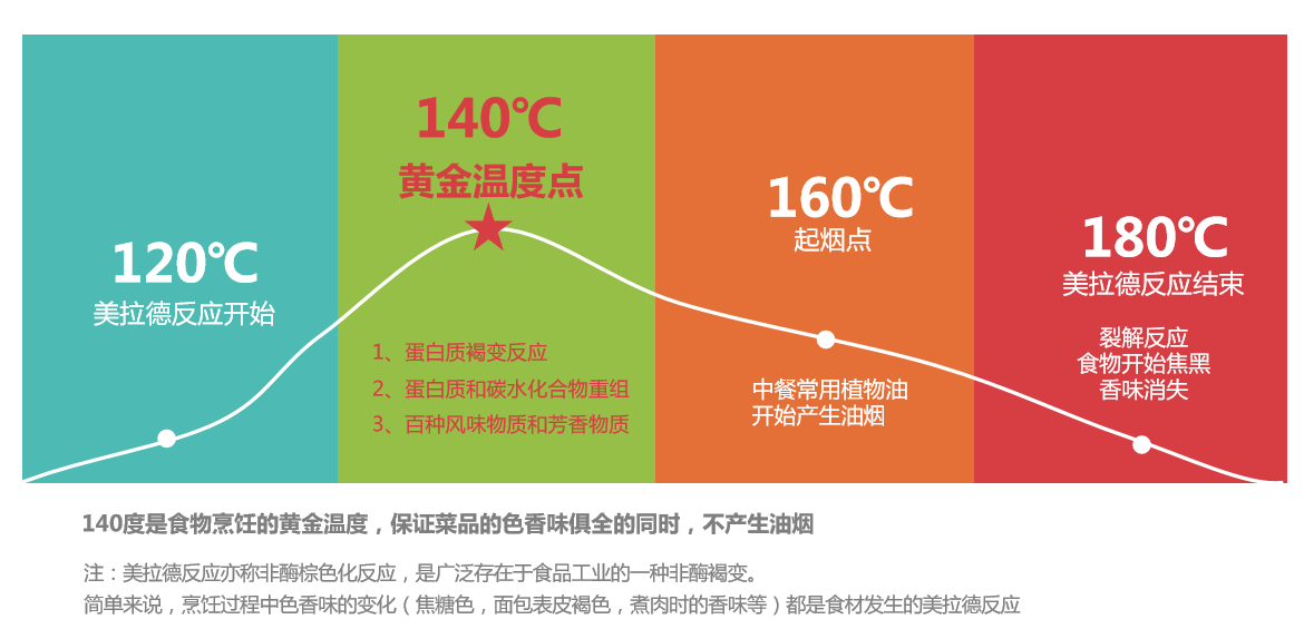 140度的无油烟黄金温度设计是米博经过严密的研究后得出的结论。在设计之初,米博研究发现,当烹饪到140度时食材会开始产生美拉德反应,色香味在这一时刻开始迸发,比如焦糖色的着色、面包表皮变褐色,煮肉时开始产生香味等等,除了食材本身的香味外,只要保证在140度以下,烹饪都不会产生油烟。到了160度时植物油开始产生油烟,180度时食物开始焦黑,美拉德反应和香味都消失殆尽。因此,米博将烹饪温度控制在140度以内,保证菜品色香味俱全的同时不会产生油烟,对人体也更加健康。
